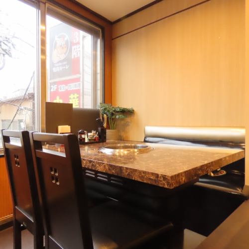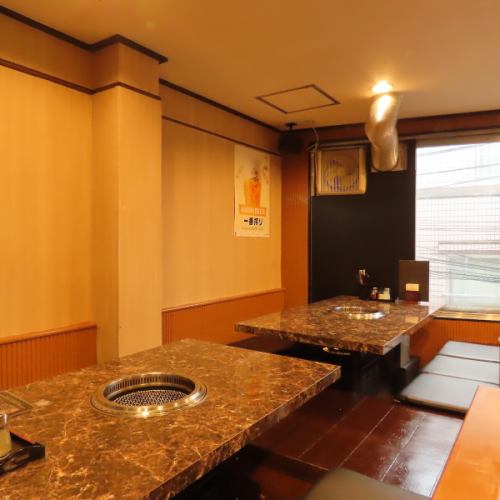 落ち着いた雰囲気の店内には、ゆったりくつろげる4人席をご用意。清潔感あふれる空間で、焼肉やお酒をゆっくり楽しめます。駅近でアクセスも良好、快適な食事をどうぞ。